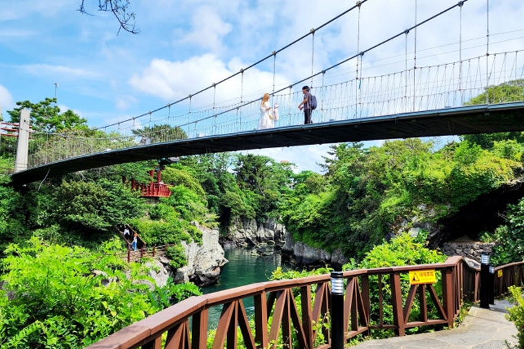 龍頭岩旁的美麗吊橋,正值櫻花季時兩旁可欣賞到美麗的櫻花,天然的兩側岩石及清流的河水造就美麗的風景,吊橋入口處還有可供情侶示愛的愛情仙人掌喔。