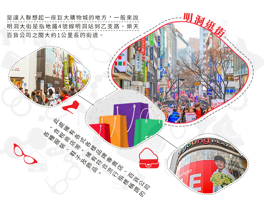 【明洞商圈】和逛街畫上等號的明洞,充斥著美利來、樂天百貨公司、AVATAR、HIHARRIET等高樓層的購物中心,還有許多知名度不高卻典雅的商店。明洞擁有吸引人群的獨特魅力,不管是要買飾品、運動鞋、皮鞋、靴子,或是中高價的商品,在明洞都可以找得到。雖然大型有名的賣場就在主要大馬路邊,但是只要再走進去一些,就會發現也有不少打折拍賣的店家喔!明洞最大的優點就是能夠享受在戶外逛街購物的休閒自在,而且各種款式和尺寸的商品應有盡有,使它成為逛街的首選,必去的景點,並讓購物客都能留下美好的記憶。